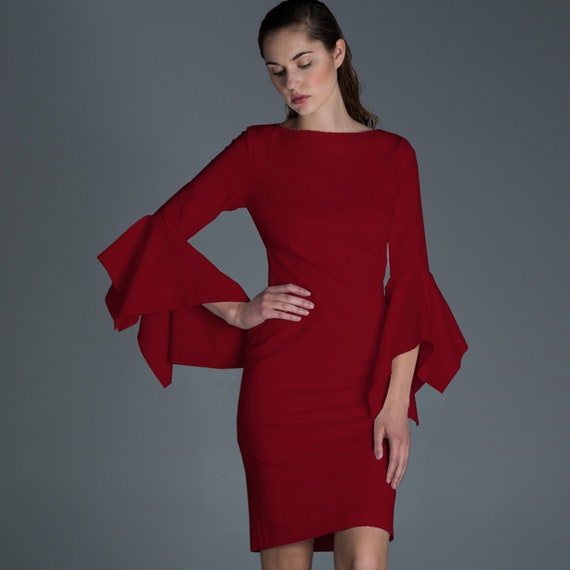Red Dress With Decorative Sleeves Cocktail Dress With Long Etsy